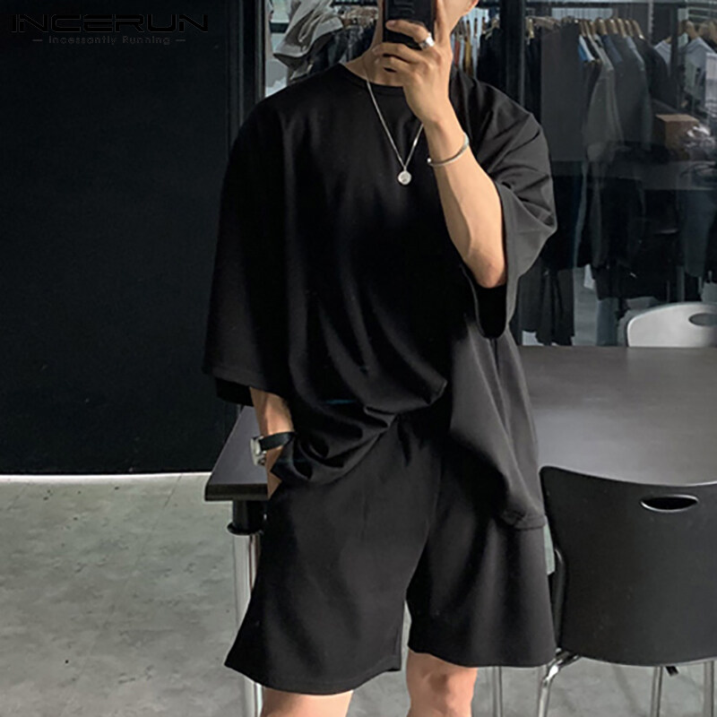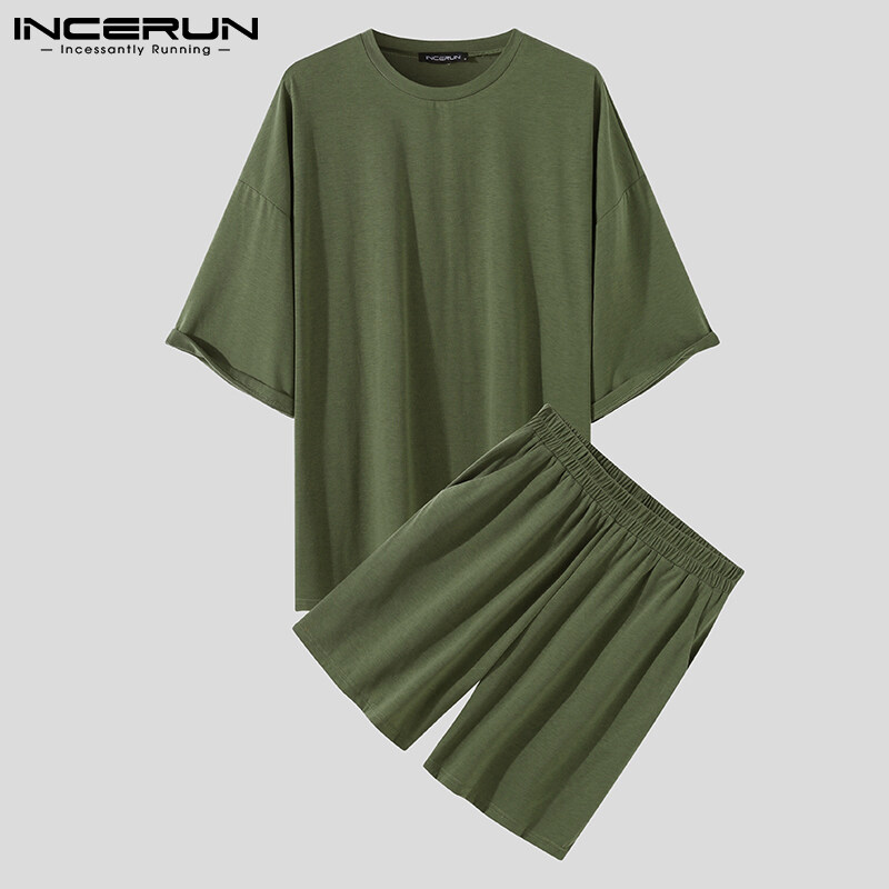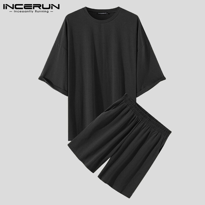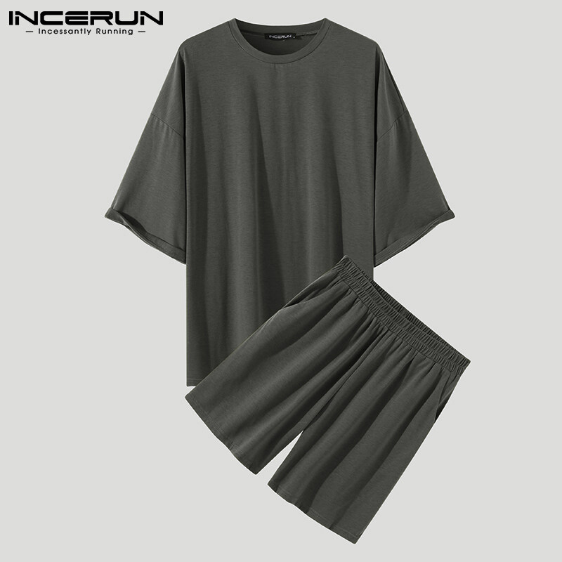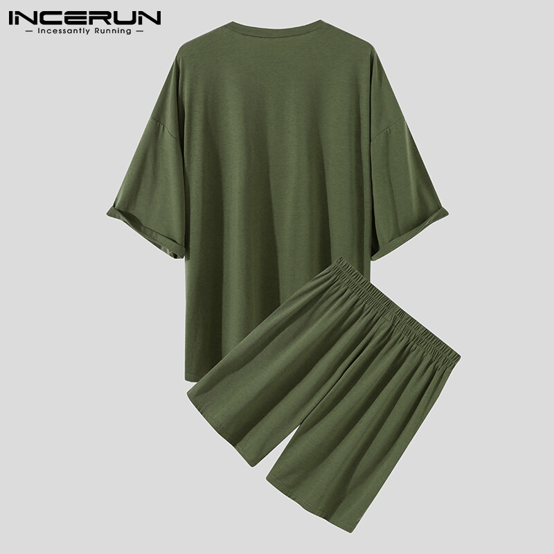 INCERUN男式短睡衣套装睡衣日式宽松上衣短裤睡衣套装(韩式)