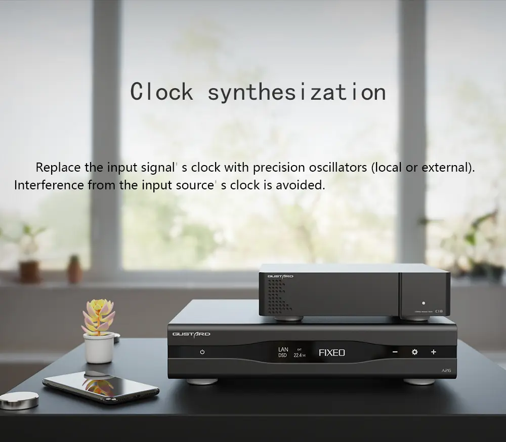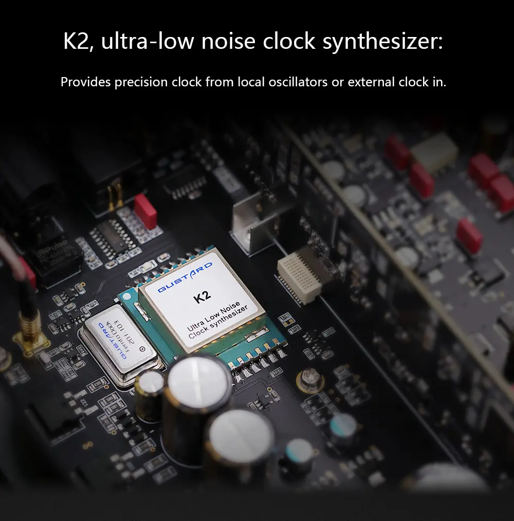 > Equipped with K2, ultra-low noise clock synthesizer, the A26 DAC features a precision clock from local oscillators or external clock in. It is worth mentioning that the GUSTARD A26 can replace the input signal' s clock with precision oscillators (local or external) and avoid the interference from the input source' s clock. In addition, the A26 DAC applies XU216 from XMOS, supporting up to PCM768 (with MQA-support) and DSD512.